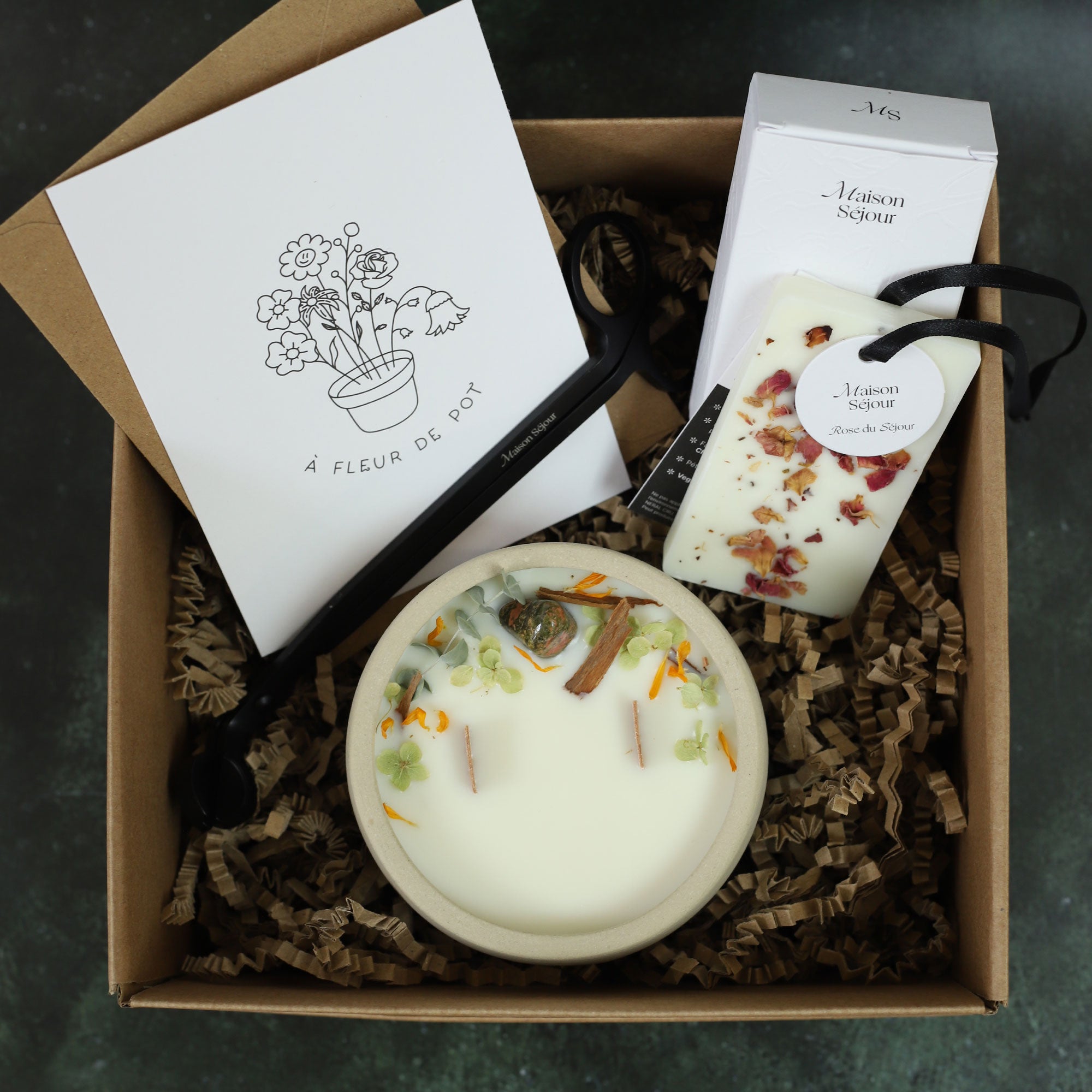Découvrez les coffrets cadeaux artisanaux de Maison Séjour, une manière originale et élégante d'offrir des moments de bien-être et de convivialité. Parfaits pour tous les types d'événements, nos coffrets sont conçus pour plaire à tous, que ce soit pour un cadeau d'anniversaire, un cadeau de mariage, ou une attention toute particulière pour des personnes comme la maîtresse, la nounou, l'ATSEM, ou vos proches tels que maman, mamie ou papa. Chaque coffret est soigneusement assemblé pour offrir une expérience sensorielle unique, alliant nos bougies artisanales parfumées à des accessoires faits main, créant ainsi un ensemble raffiné et éco-responsable.