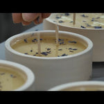 Chaque bougie fleurie en grès Maison Séjour est coulée et décorée à la main dans notre atelier, en cire végétale de soja provenant de culture Européenne issue de ressources renouvelables et biodégradable.